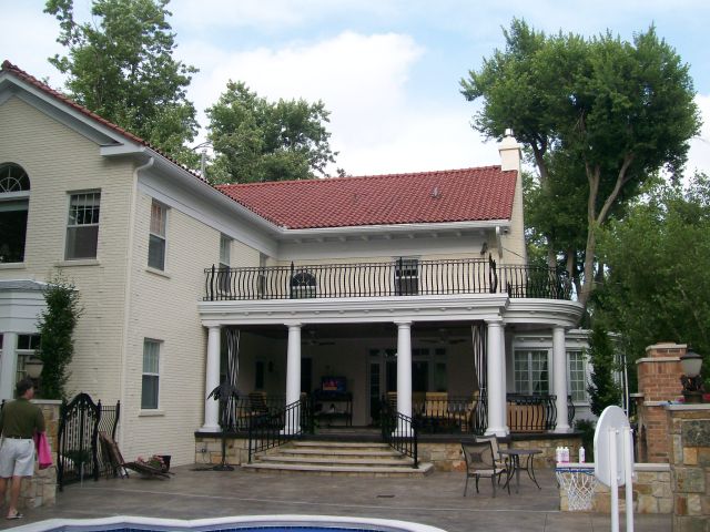 New architectural elements blend with historic features of house while displaying a contemporary upgrade. concrete deck, structural columns, flat roof, skylites, cedar ceiling, limestone stairs and custom iron railings.